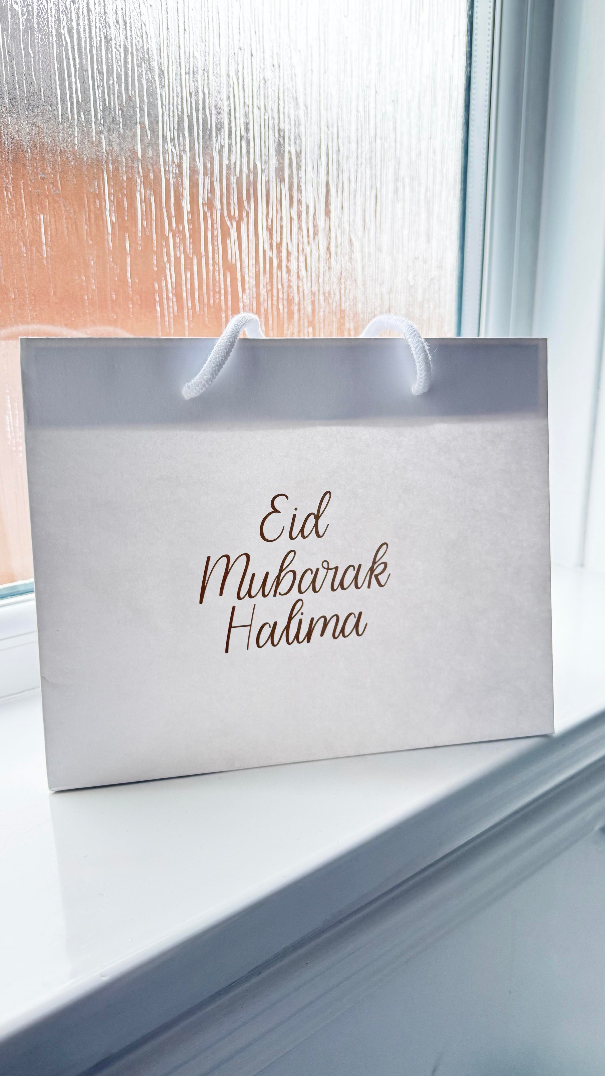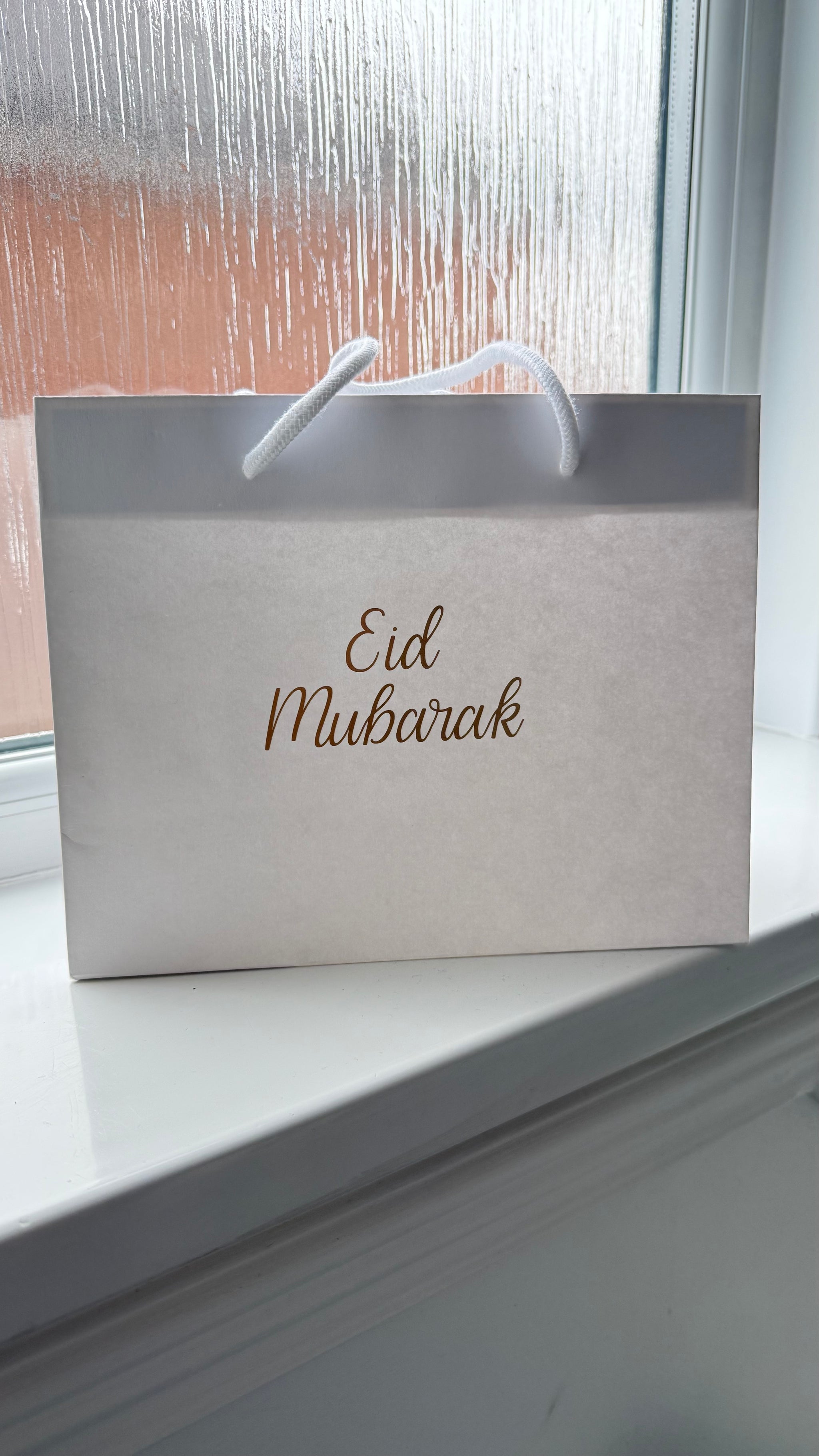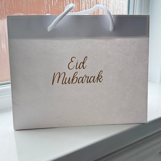 These medium landscape gift bags feature a sleek Eid Mubarak champagne vinyl design that adds elegance to any Eid celebration. Perfect for gifting to loved ones, these bags are a convenient and stylish choice. Celebrate with ease and sophistication with these Eid Mubarak gift bags.